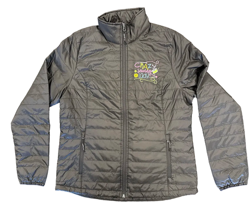 Announce It With All The Pride It Deserves! This stylish black puffy jacket features the playful and colorful “Crazy Sewing Lady” embroidery design...
